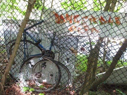 Okay, so all I could see was the fence. As I began my stroll along the perimeter, it was clear that they were trying their best to keep out unexpected visitors. In total, there were 3 layers of barbed wire fence and, although, I could identify the locations of where many holes once were, I could tell they had made a great effort to patch them back up, occasionally with more “innovative” items like torn-apart bicycles.